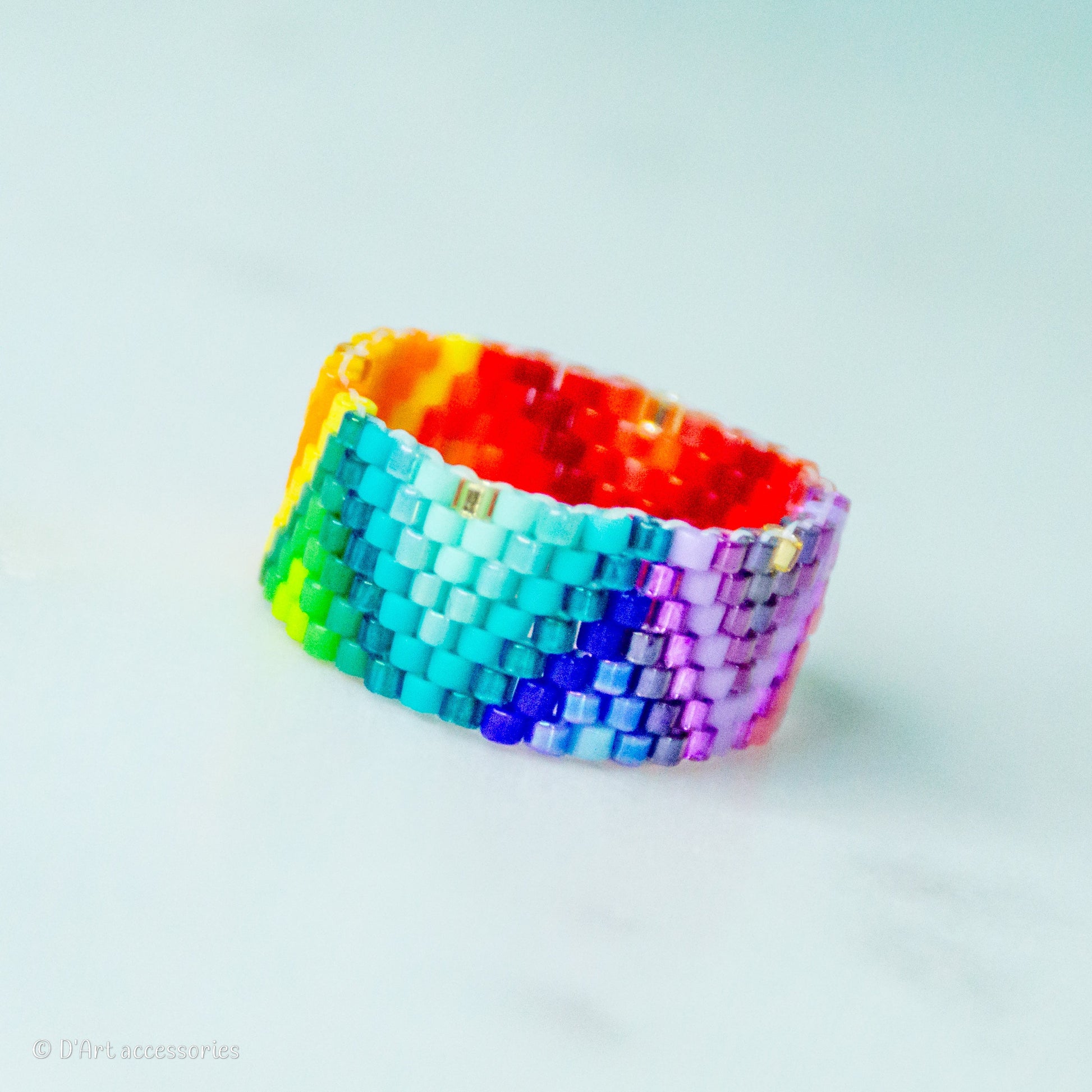 Expertly crafted using the peyote weaving technique with a pattern of colorful miyuki beads, this multicolored beaded ring is a stunning addition to any jewelry collection. Woven into a triangle design, this ring is both unique and eye-catching, adding a touch of elegance to any outfit.